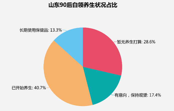 據統計,現如今中國有一大部分年輕人都開始注重養生,且山東省90后已經有過半年輕人開始養生。下圖為山東90后白領養生狀況占比,據調查顯示,已有40.7%的白領開始養生;更有13.3%白領表示長期在使用保健品;有17.4%的白領意向養生并持觀望態度;僅有28.6%的白領表示無養生打算。
