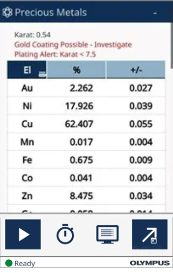 如圖所示,透過Vanta GX 貴金屬分析儀驗(yàn)證金飾時(shí),得知此金飾的純金含量只有2.262%的黃金(Au)含量,但鎳(Ni)含量為17.926%、銅(Cu)含量高達(dá)62.407%。故可得知此金飾為俗稱白銅的鎳銅合金,鍍金上一層薄薄的黃金,因?yàn)閂anta GX除了告知金屬含量為何外,若有遇到樣品疑似有鍍金(Coating)的狀況,也都會(huì)在窗口中一并告知(如圖上方的紅色警告字語)。