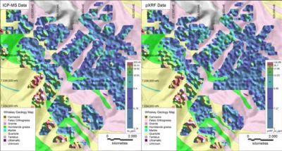 來自加拿大的金元素勘探項目,XRF分析儀在野外繪制的表面土壤中As、Cu和Pb元素等值線圖對比ICP分析。