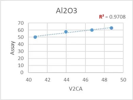 我們可以通過上圖發現,Vanta Core (V2CA) 檢測結果與滴定法的化驗結果之間呈現了良好的線性,也印證了X射線熒光分析儀檢測的可靠性。在進行簡單的校準后,可以使設備顯示理想的數值。