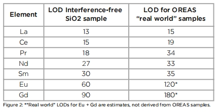 手持設(shè)備中的典型的X射線管只能工作到50 kV,稀土元素的有效激發(fā)能量差。而SciAps X-555采用55 kV的X射線管,大約能產(chǎn)生10倍以上的X射線有效激發(fā)能量。無干擾(二氧化硅)和高度具有挑戰(zhàn)性的OREAS REE礦石的值(這可以在圖2中找到)。LOD用于背景以上的3西格瑪檢測(cè),120秒的測(cè)試時(shí)間。Sciaps光譜儀可作為化探手段。有規(guī)劃的進(jìn)行土壤、巖石露頭測(cè)試,剖面測(cè)試,光譜數(shù)據(jù)可作為地質(zhì)資料。常用礦石模式和土壤模式。無需進(jìn)行樣品制備或簡(jiǎn)單樣品制備。
