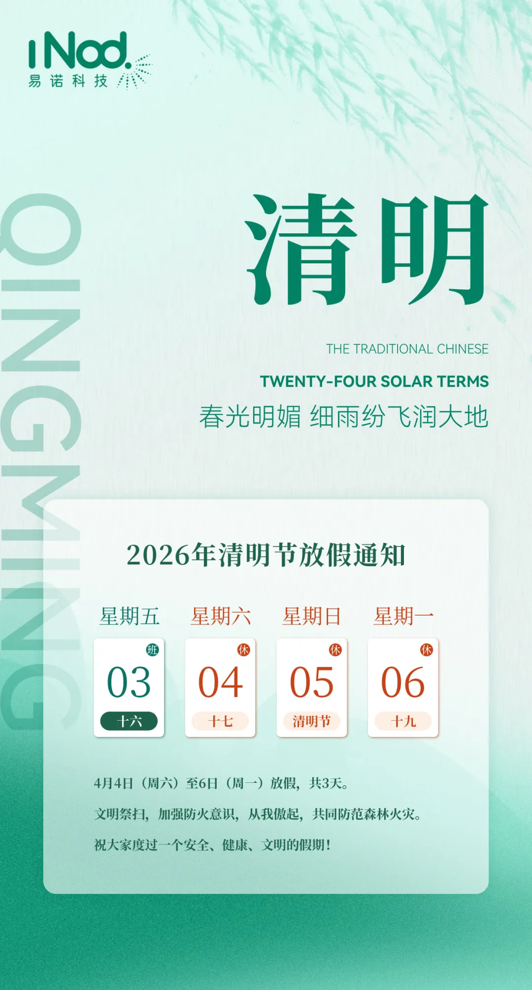 根據(jù)國(guó)務(wù)院辦公廳節(jié)假日安排,結(jié)合公司實(shí)際情況,現(xiàn)將 2026 年清明節(jié)放假事宜通知如下: