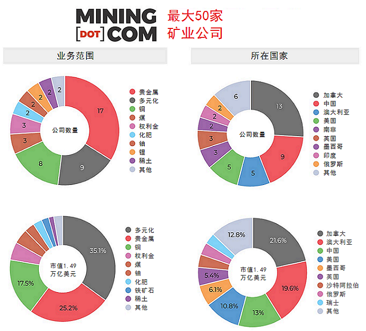目前50家最大礦企中,總部設在加拿大的礦企有13家,總市值為3200億美元,占50強總市值的22%。總部設在澳大利亞的礦企有5家,總市值為2930億美元,其中來自悉尼的埃沃盧申礦業公司(Evolution Mining)今年首次進入。