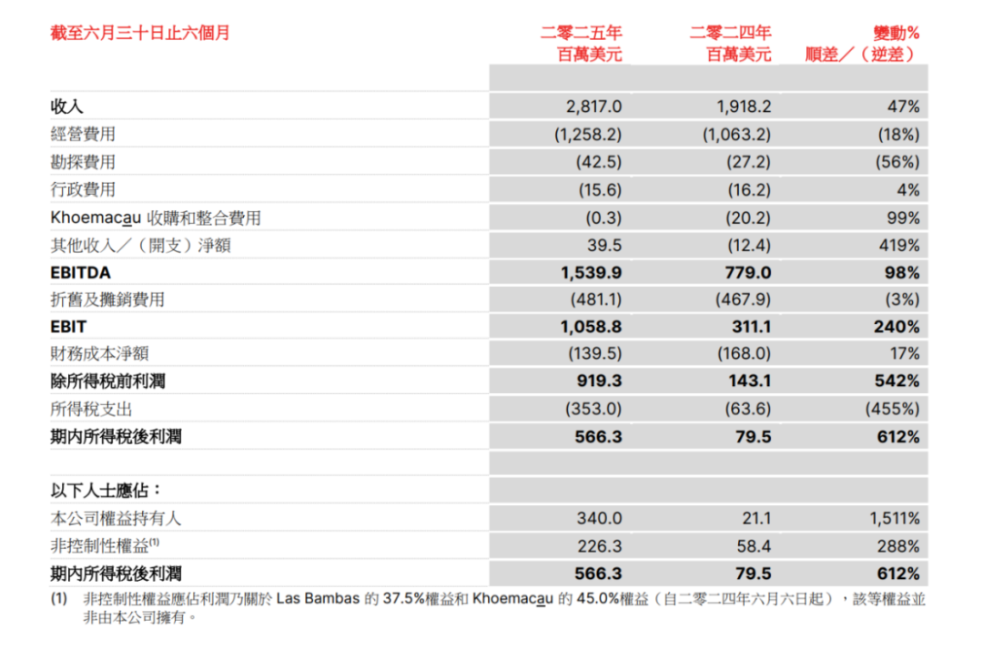 8月12日晚間,五礦資源披露半年業(yè)績(jī),2025年上半年,五礦資源實(shí)現(xiàn)收入28.17億美元,同比增長(zhǎng)47%;除稅后利潤(rùn)達(dá)5.663億美元,與上年同期的0.795億美元相比,實(shí)現(xiàn)了612%增長(zhǎng);公司權(quán)益持有人應(yīng)占利潤(rùn)3.40億美元,與上年同期的0.211億美元相比,實(shí)現(xiàn)了超過15倍的增長(zhǎng)。